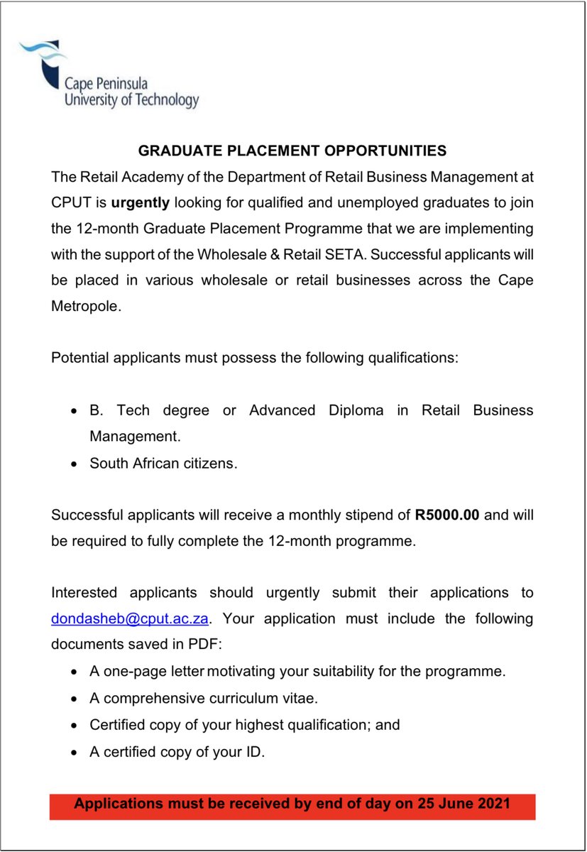 Cput Students On Twitter Opportunity For A 12 Month Graduate Placement Stint For Unemployed Cput Graduates With Either A B Tech Or Advanced Diploma In Retail Business Management Closing Date Is Friday 25th